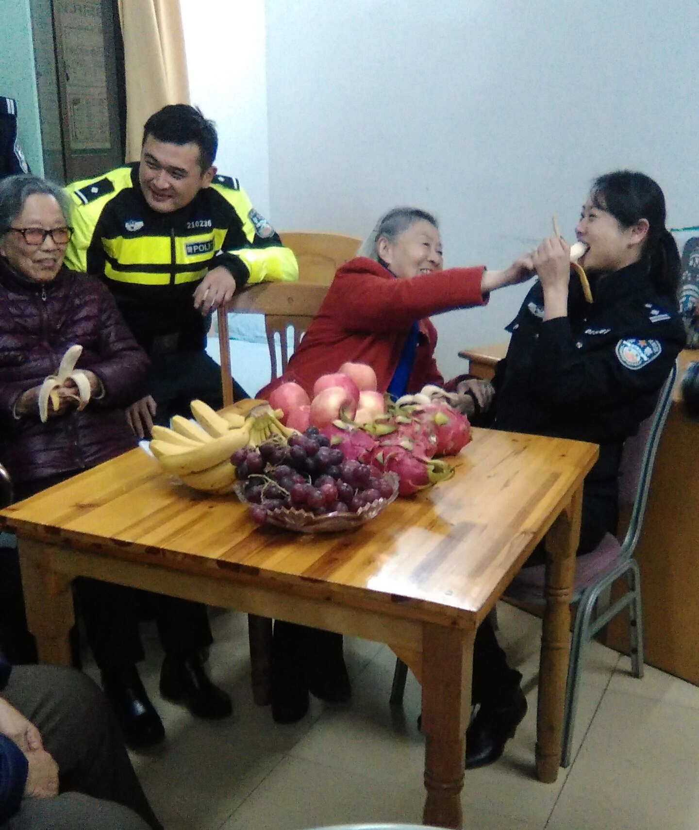 老人們也紛紛熱情的拿出水果給同志們,現(xiàn)場氣氛融洽。
