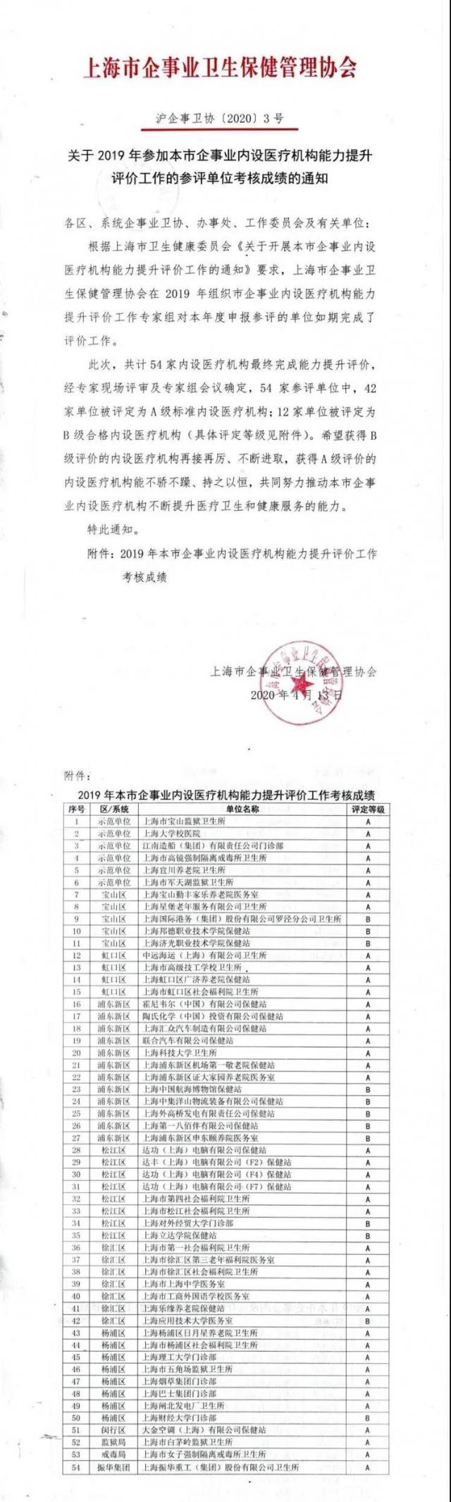 據(jù)悉,根據(jù)上海市衛(wèi)生健康委員會《關(guān)于開展本市企事業(yè)內(nèi)設(shè)醫(yī)療機(jī)構(gòu)能力提升評價工作的通知》要求,上海市企事業(yè)衛(wèi)生保健管理協(xié)會在2019年組織市企事業(yè)內(nèi)設(shè)醫(yī)療機(jī)構(gòu)能力提升評價工作專家組對2019年度申報參評的單位開展了評價工作。此次共計54家內(nèi)設(shè)醫(yī)療機(jī)構(gòu)最終完成能力提升評價,經(jīng)專家現(xiàn)場評審及專家組會議確定,其中42家單位被評定為“A級標(biāo)準(zhǔn)內(nèi)設(shè)醫(yī)療機(jī)構(gòu)”。